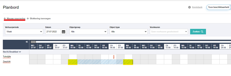 In het planbord klik je op de aankomst datum en daarna op de vertrekdatum en het systeem vult de hele periode in. Vervolgens klik je op + Nieuwe Reservering. Bij een reservering per week en weekend klik je alleen op de aankomst datum en vervolgens op + Nieuwe Reservering. Het systeem neemt de gewenste reisduur automatisch over.