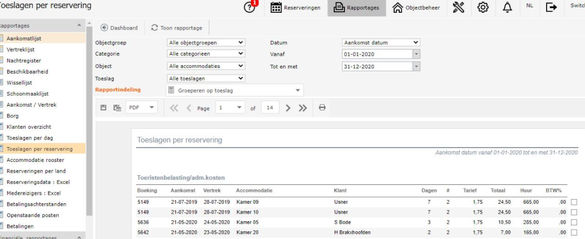 rapportages > toeslagen per reservering > selecteer datum > toeslag ''toeristenbelasting/adm.kosten > rapportindeling ''groeperen op toeslag''